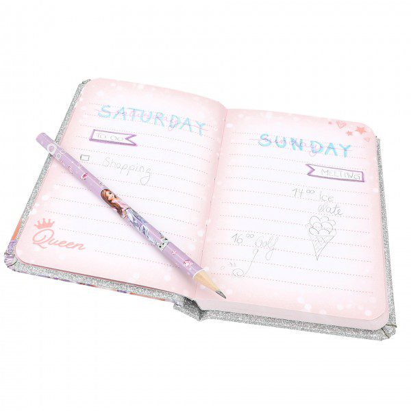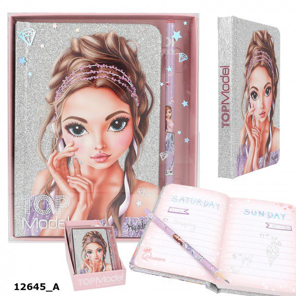 Brillo, glamur, genial! Este maravilloso bloc de notas cubierto totalmente de purpurina y con la imagen de una guapísima modelo en la portada, va acompañado de un lápiz a juego rematado con un diamante rosa. Las páginas tienen ilustraciones a todo color y pauta fina.