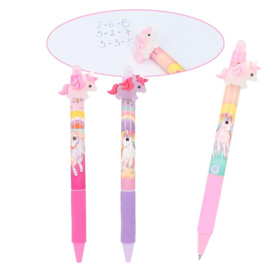 Al quitar el unicornio aparece la mina. La tinta de estos preciosos rotuladores de gel de Ylvi se borra muy fácilmente. Disponibles en tres diseños distintos: lila y fucsia blanco y violeta rosa y fucsia. La tinta es de color azul y la mina no es recambiable.