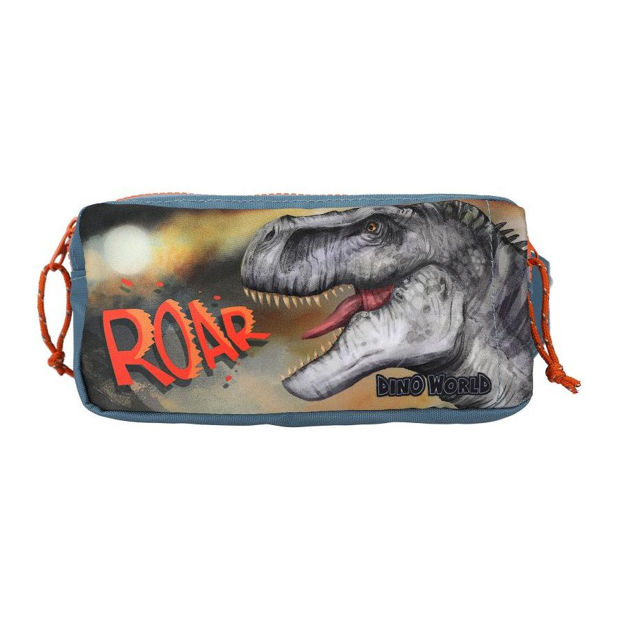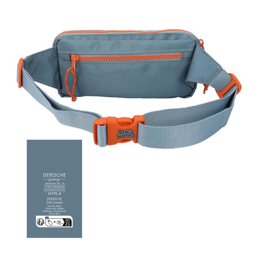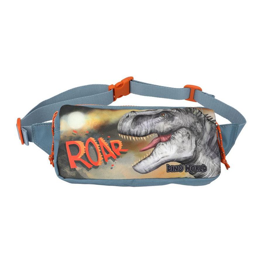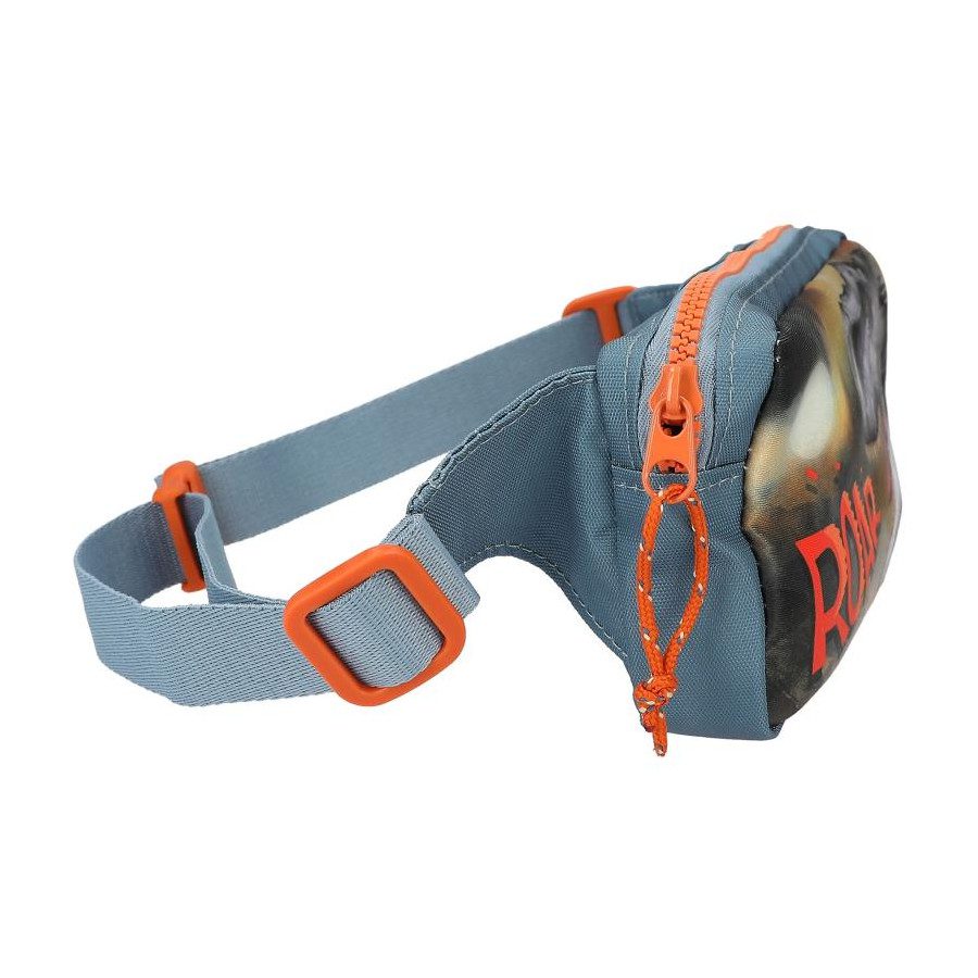 La cara delantera de esta riñonera de Dino World color azul petróleo con detalles naranja destaca por la aplicación de la cabeza de un tiranosaurio rex impresionante.