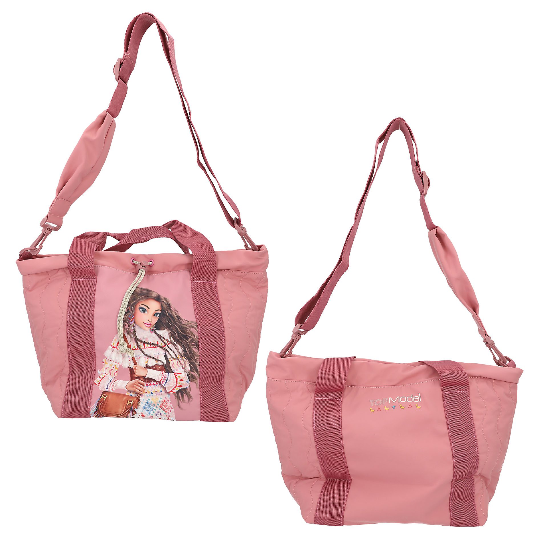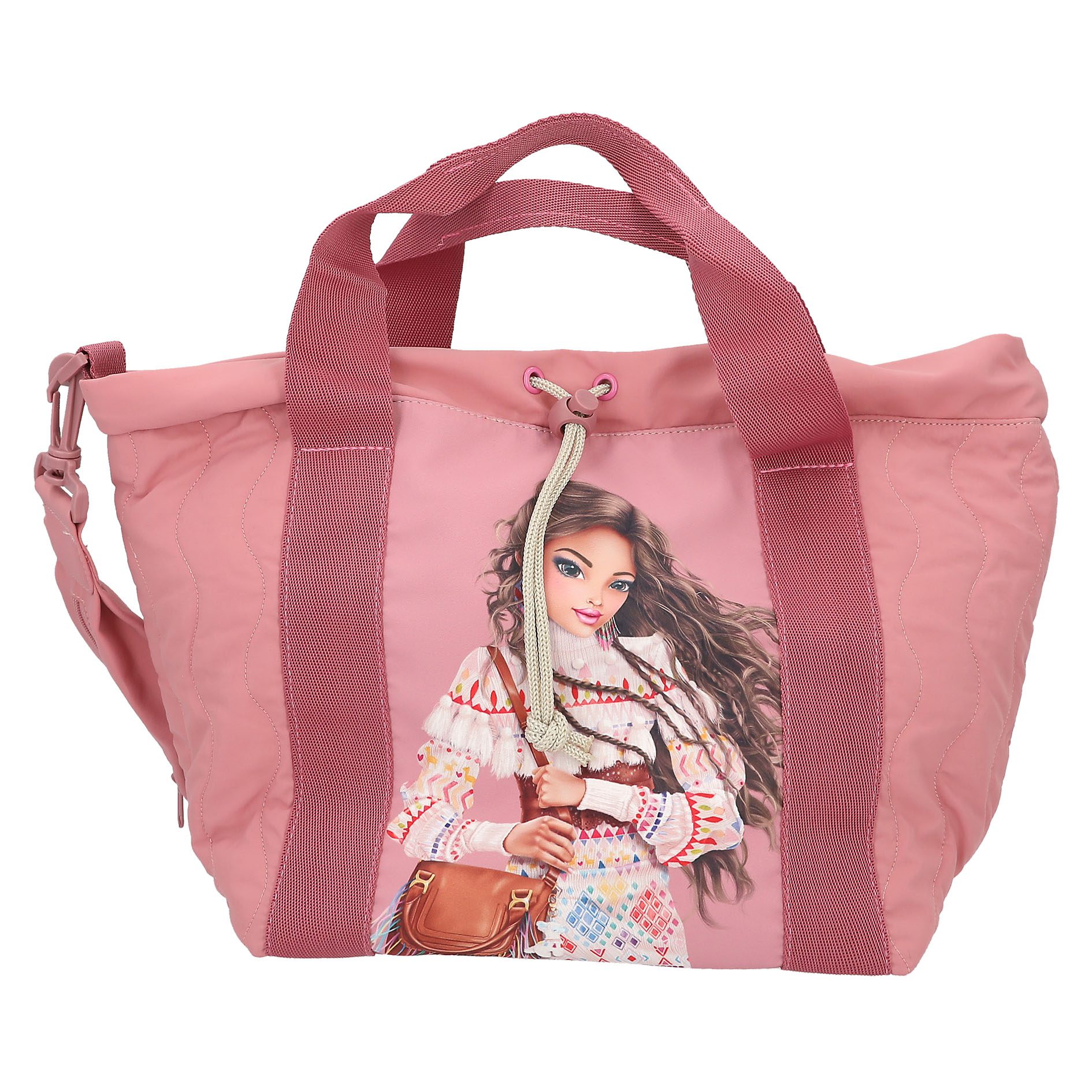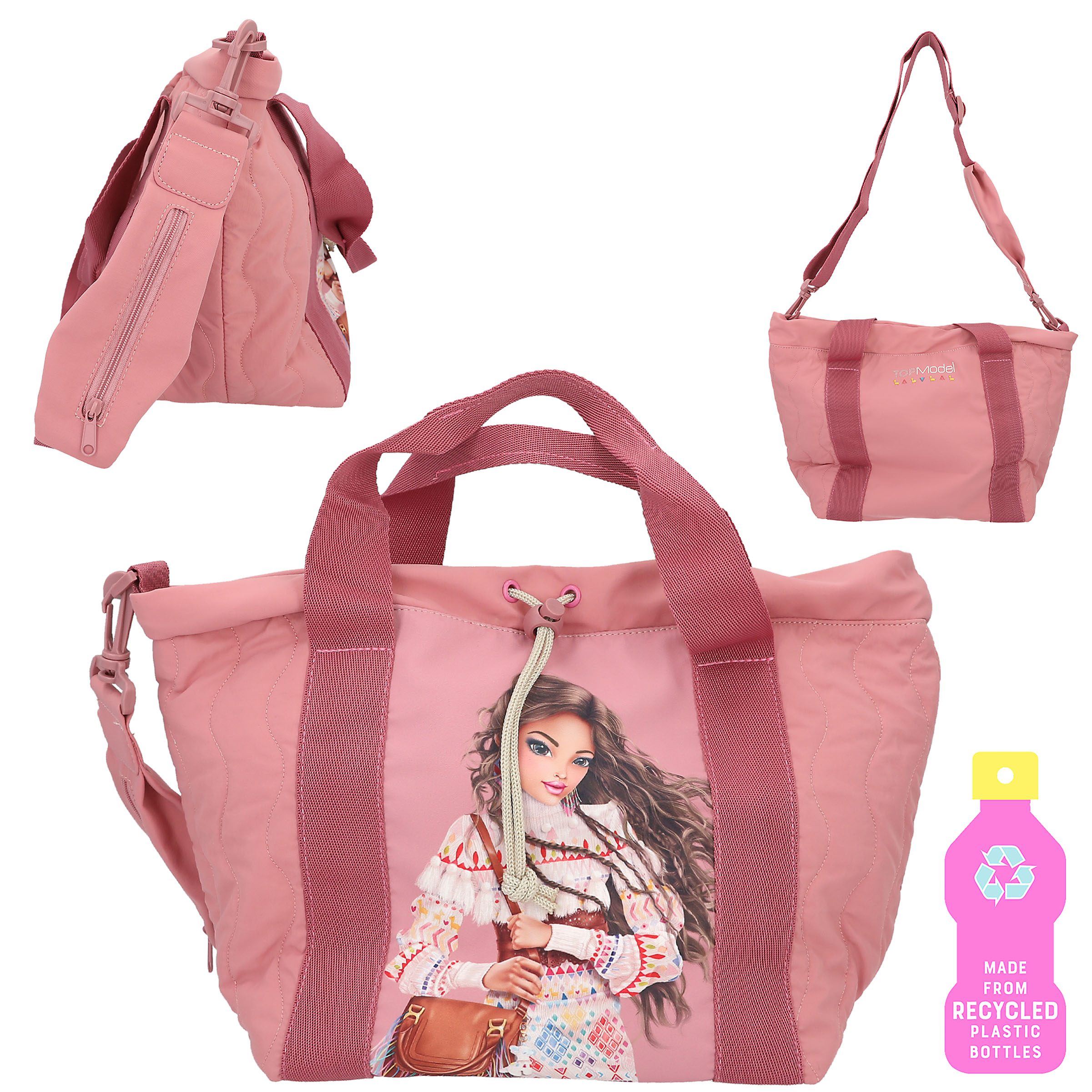 El bolso shopper de TOPModel color rosa viejo con detalles pespunteados tendencia, destaca por la imagen a gran tamaño de una modelo en la cara delantera. El bolso cierra mediante un práctico cordón ajustable y un botón de presión adicional. Las asas cortas son de la misma gama de color, pero en tono más oscuro, creando un bonito contraste. La bandolera es ajustable y extraíble y, además, lleva integrado un práctico bolsillo con cremallera para llaves o monedas. Material principal: poliéster reciclado 100 por 100 interior: poliéster 100 por 100.
