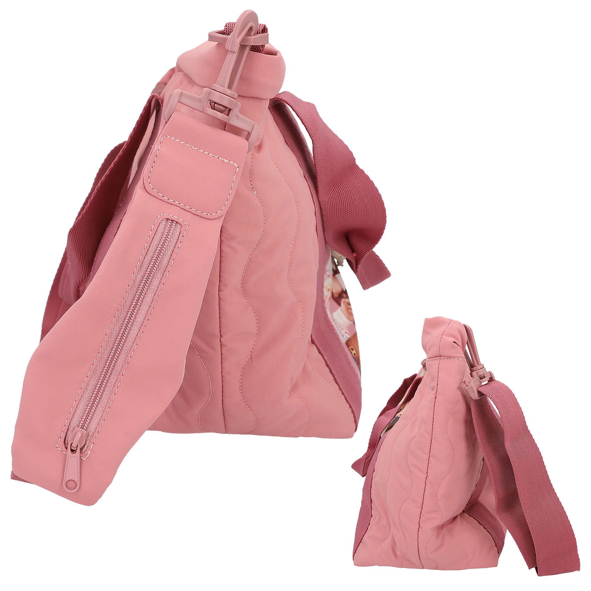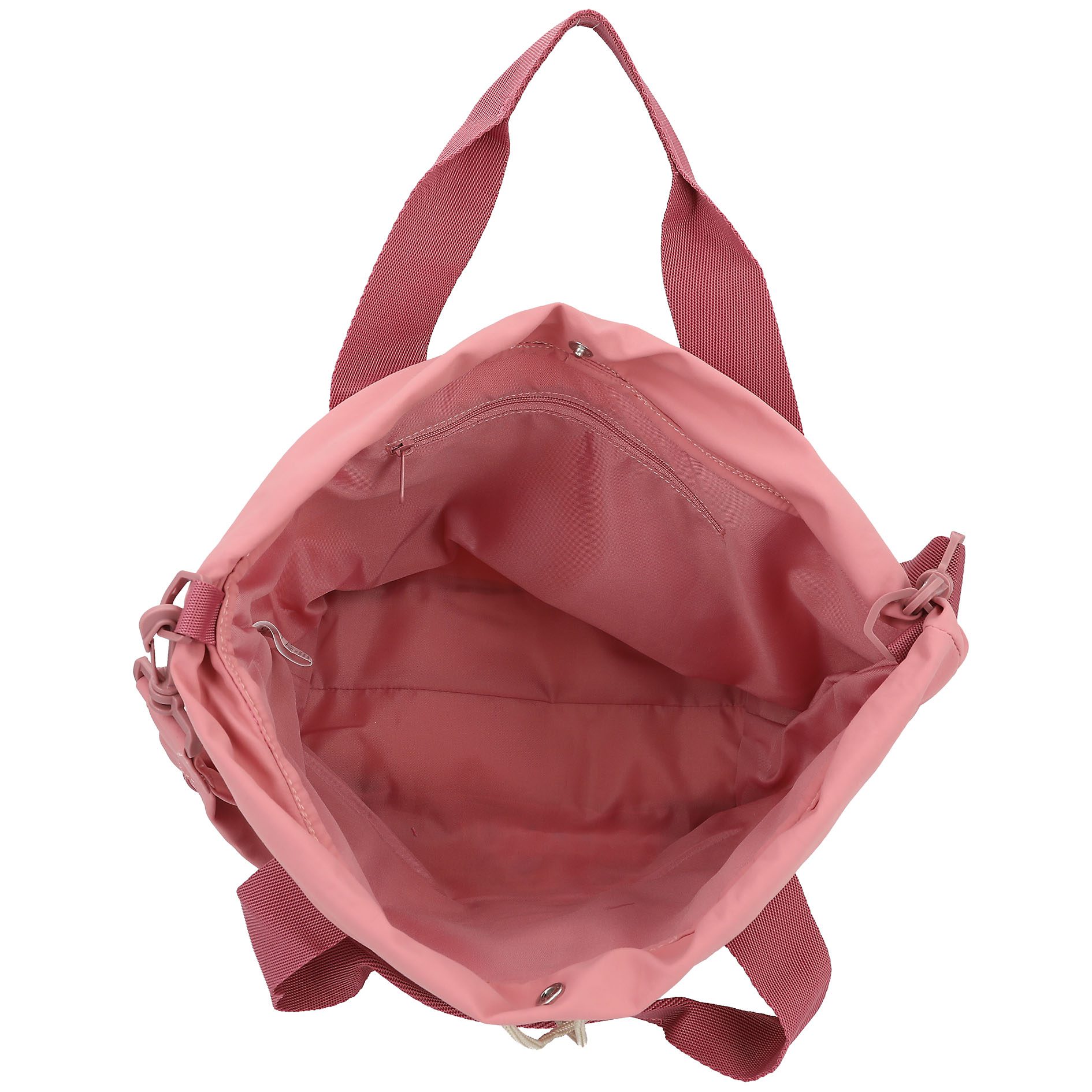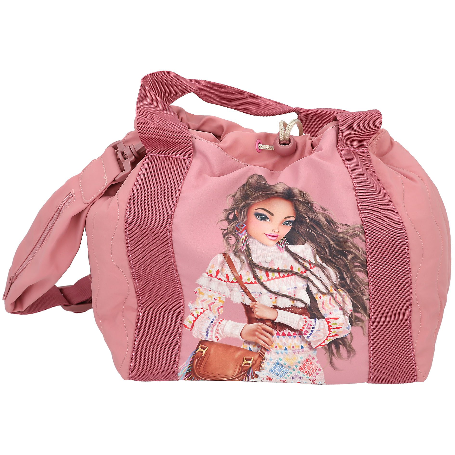El bolso shopper de TOPModel color rosa viejo con detalles pespunteados tendencia, destaca por la imagen a gran tamaño de una modelo en la cara delantera. El bolso cierra mediante un práctico cordón ajustable y un botón de presión adicional. Las asas cortas son de la misma gama de color, pero en tono más oscuro, creando un bonito contraste. La bandolera es ajustable y extraíble y, además, lleva integrado un práctico bolsillo con cremallera para llaves o monedas. Material principal: poliéster reciclado 100 por 100 interior: poliéster 100 por 100.