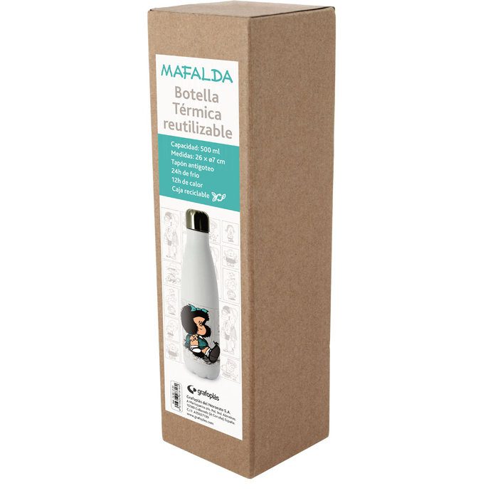 Botella térmica de 0,5 l con diseño basado en los comic de Mafalda. Botella reutilizable dónde podrás llevar tus bebidas favoritas y resistirá a los días de mucho frío y de calor. Gracias a su tamaño podrás llevarla a la playa, trabajo, colegio,.. – Capacidad: 500ml. – Medidas: 26 x Ø7 cm. – Con tapón antigoteo. – Mantiene 24 horas el frío. – Mantiene 12 horas el calor. – Embalada en caja reciclable.