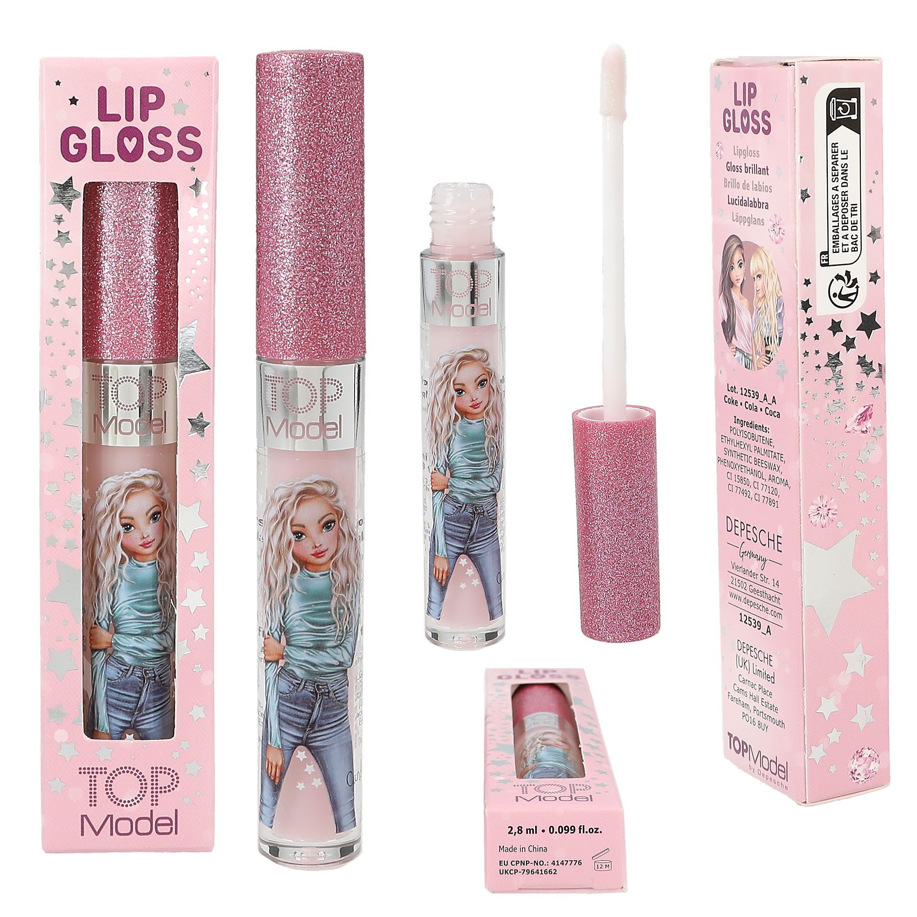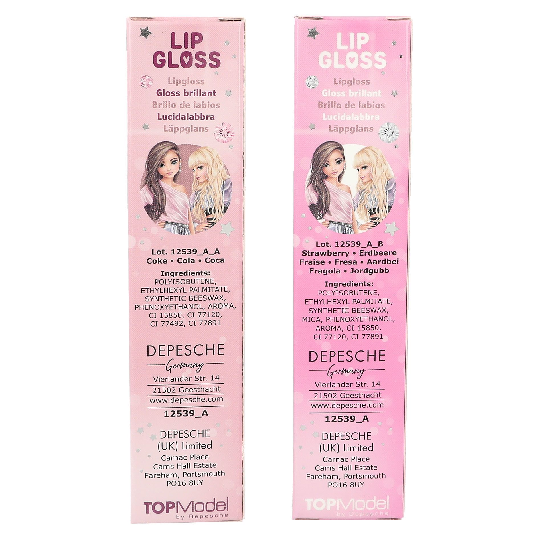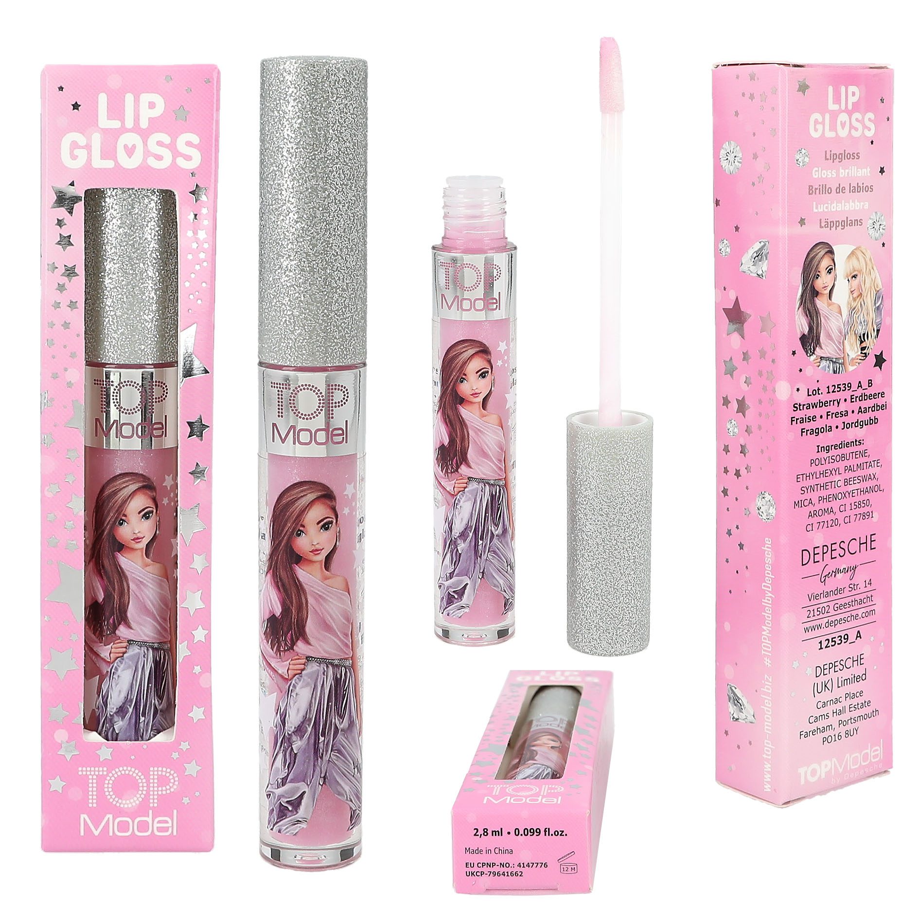 Brillo genial! El gloss labial de TOPModel con tapa brillante está disponible en dos colores y dos aromas: gloss fucsia con aroma a fresa y tapa color frambuesa, así como gloss rosa con aroma a cola y tapa plateada. Contenido por tubito: 2,8 ml. Modelo y/o color según disponibilidad. Indicar preferencia en apartado de información adicional.