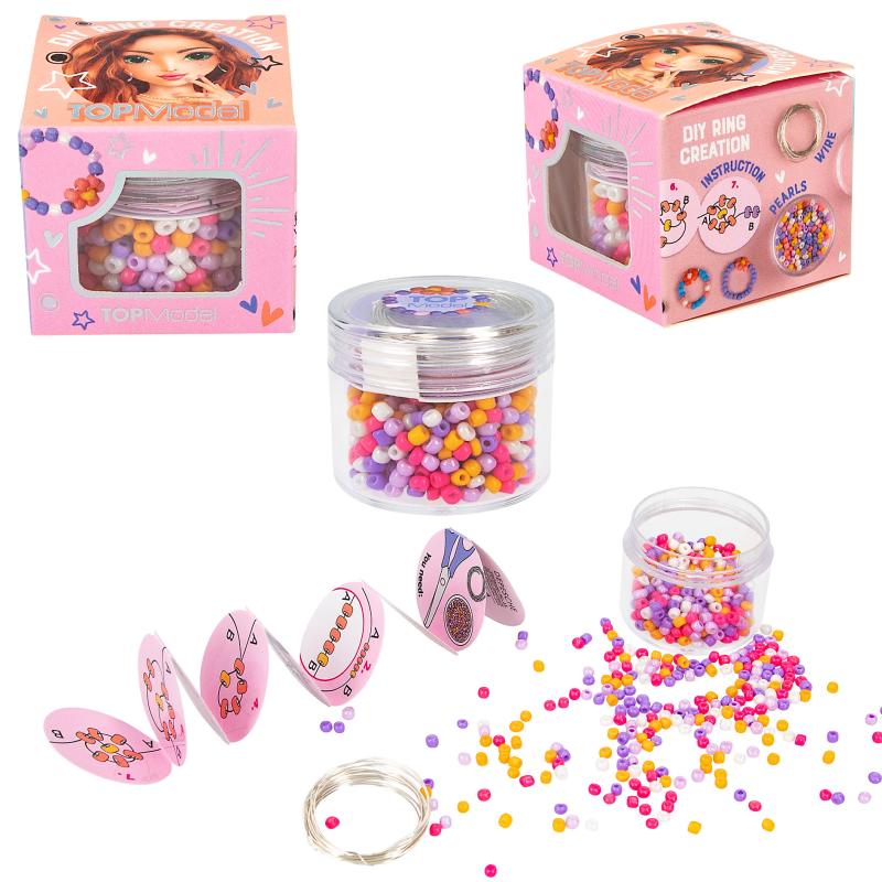 Así se diseña la auténtica bisutería de TOPModel. Con este set de manualidades HTM las niñas podrán crear sus propios anillos. Incluye instrucciones paso a paso para hacer un anillo con forma de flor, además de un código QR que permite abrir un vídeo con instrucciones. Las pequeñas cuentas (3 mm) y el alambre (1,5 m) vienen dentro de un tarrito transparente con cierre de rosca. Disponibles dos diseños con los siguientes colores: cuentas color azul, coral, blanco, malva y rosa o cuentas en colores lila, malva, rosa, blanco y amarillo.