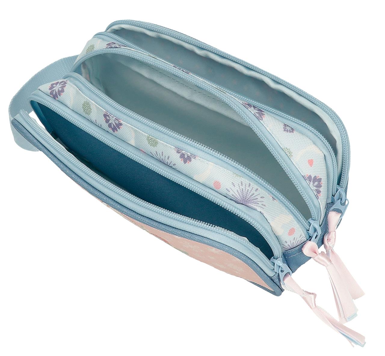 Estuche de 22 cm x 10 cm x 9 cm fabricado en Poliéster. Tres compartimentos independientes de cremallera para mejorar la organización. Perfecto para organizar y llevar recogidos los lápices y bolígrafos. Asa lateral para colgarlo.