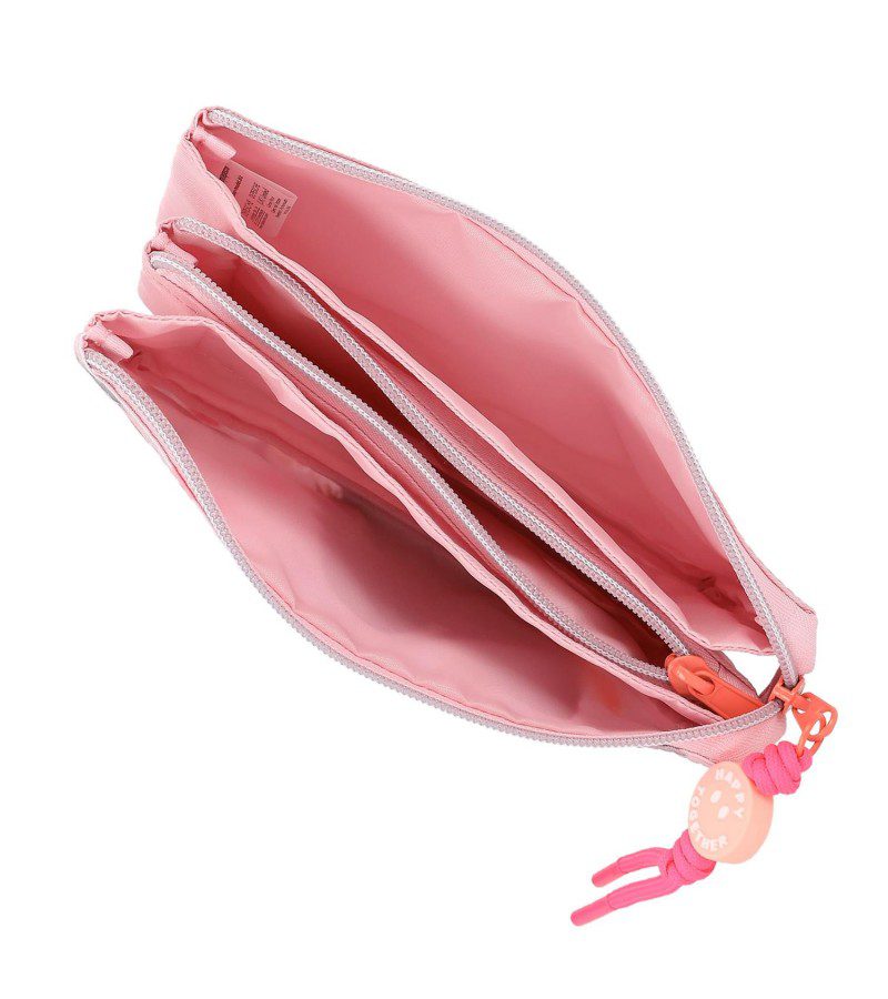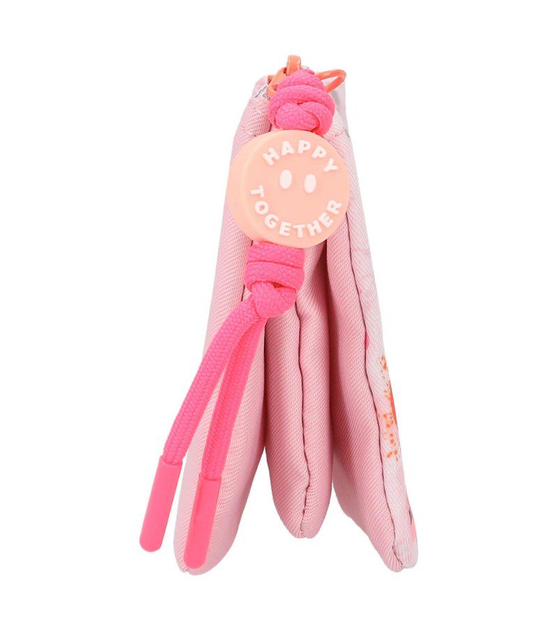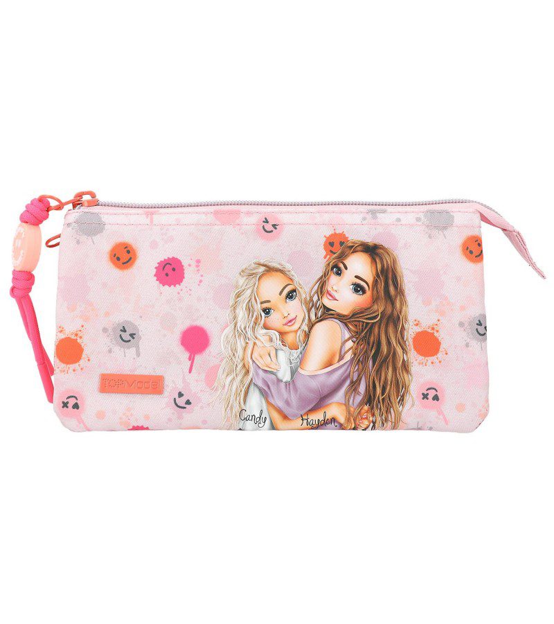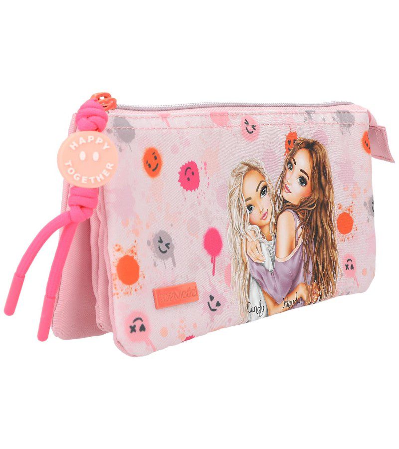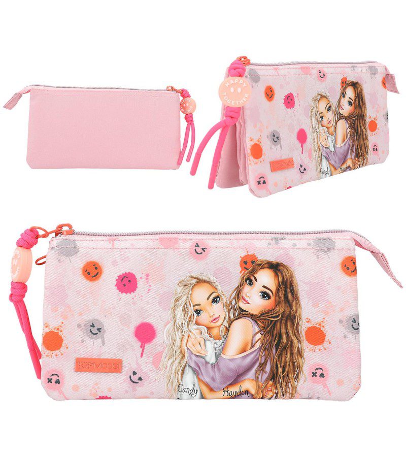 Estuche con estampado de smileys y dos modelos de TopModel en un fondo rosa claro. De la cremallera cuelga un detalle que pone Happy together en forma de emoticono. Tiene tres compartimentos, separados con dos cremalleras.