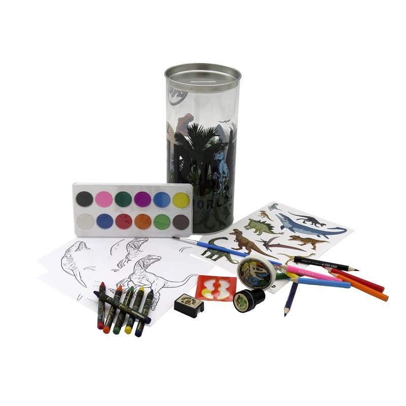 Este set de actividades se puede usar como hucha y además contiene varios accesorios de dibujo y papelería en su interior. CARACTERÍSTICAS: Con este original set de actividades podrás ahorrar, ya que viene en una caja que también puede usarse como hucha. En su interior incluye 4 hojas para dibujar, 2 plantillas, una goma de borrar, un sello, un sacapuntas y una hoja de pegatinas además de 8 lápices de colores, 12 acuarelas, un pincel y 6 ceras de colores.