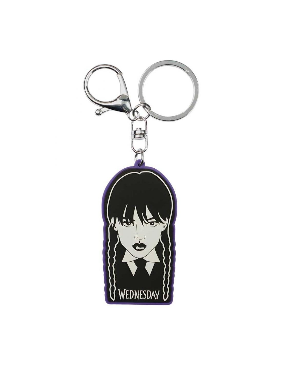 Llavero de PVC blando con cara de Miércoles, tanto en el diseño delantero como en el trasero. Incluye anilla y gancho metálicos. Dimensiones: 0,5 x 4,9 x 6,8 cm