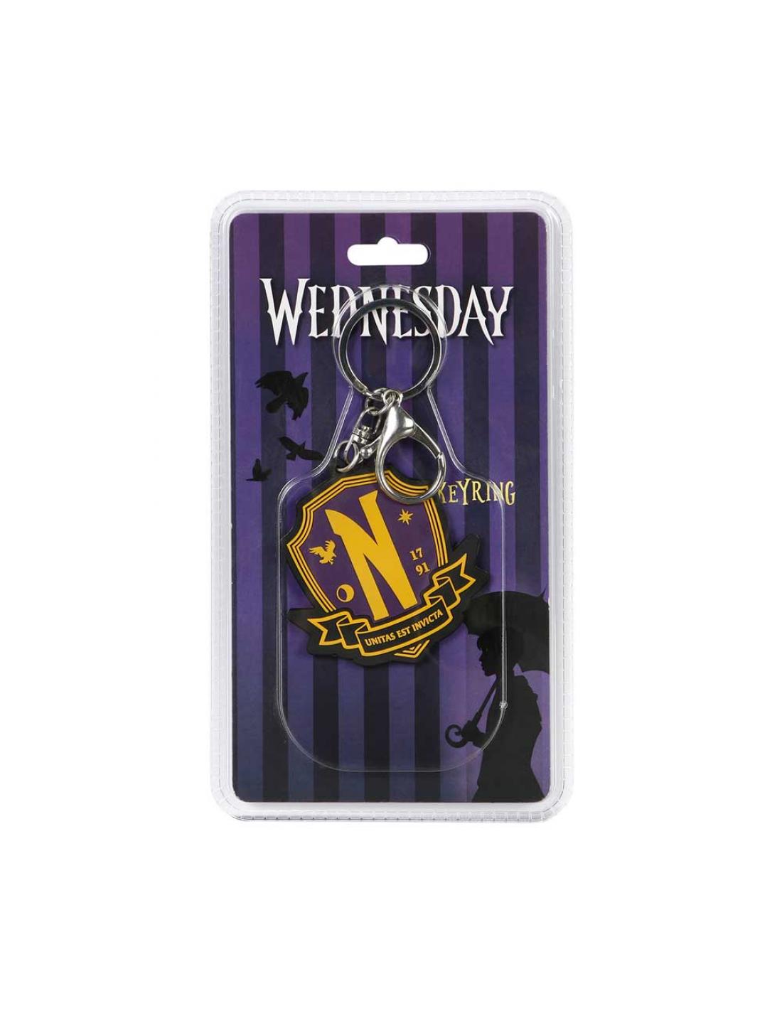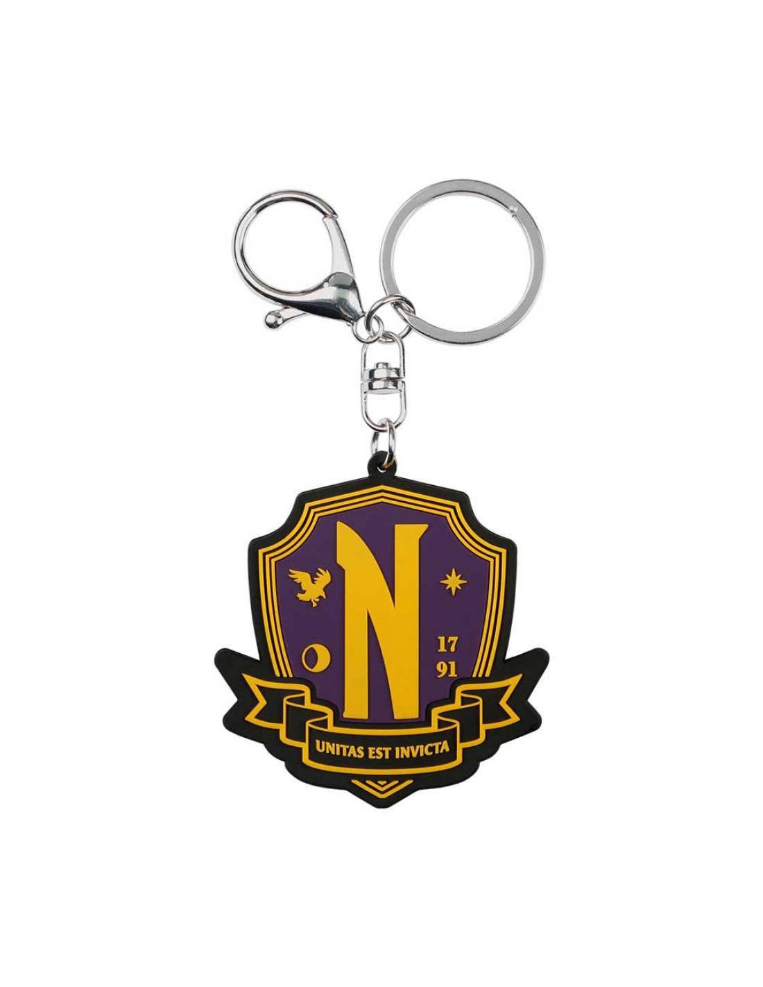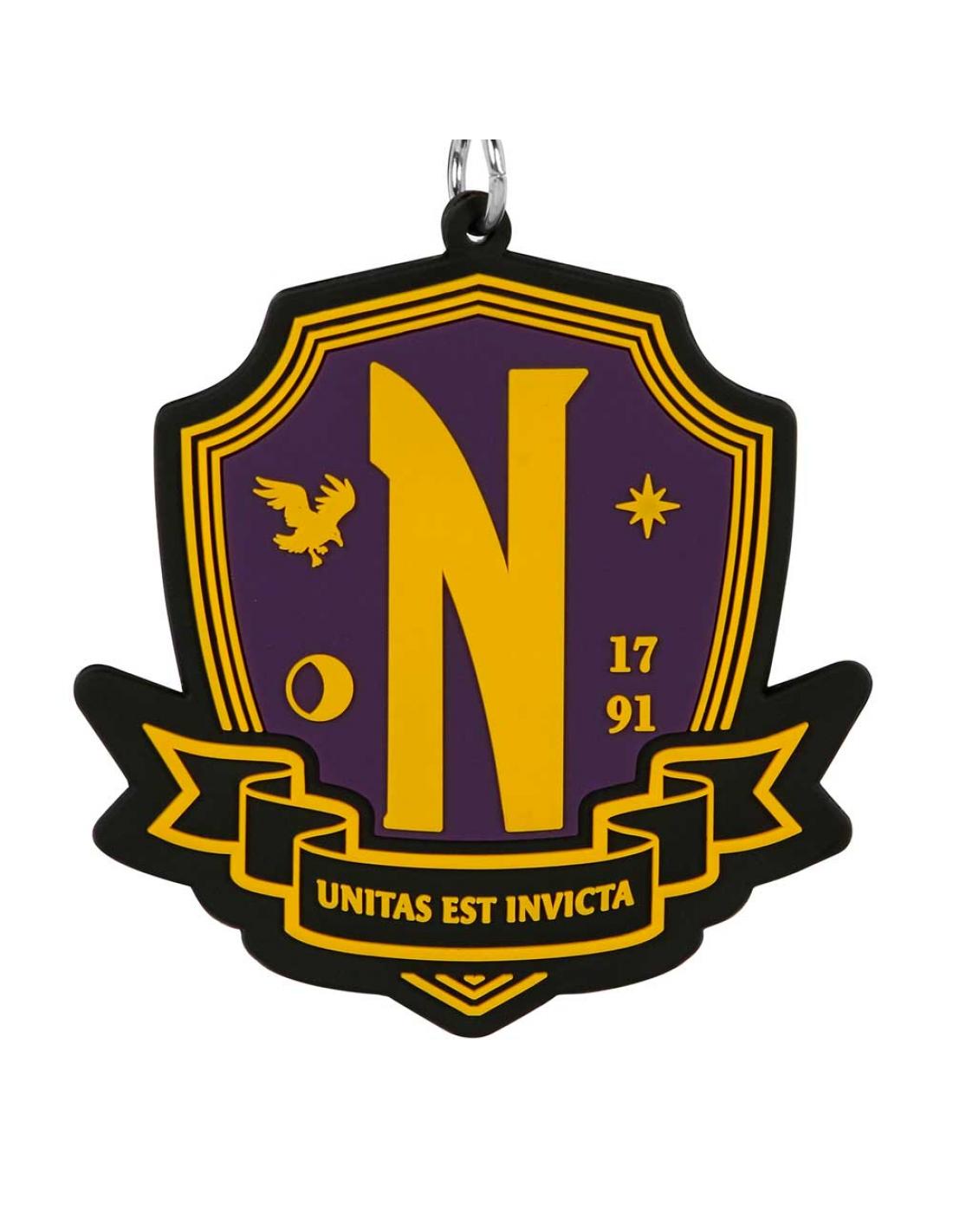 Llavero de PVC blando con escudo de la escuela Nevermore, tanto en el diseño delantero como en el trasero. Incluye anilla y gancho metálicos. Dimensiones: 0,6 x 6 x 6 cm