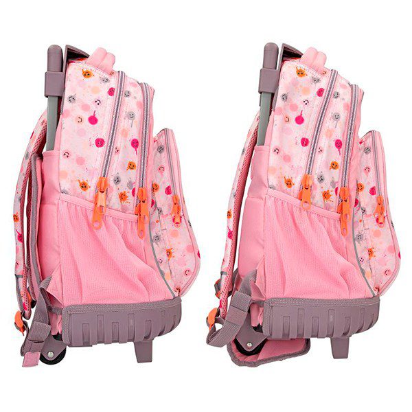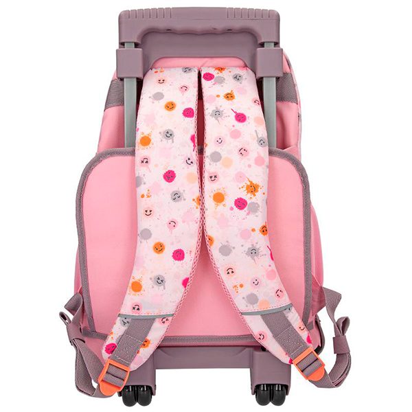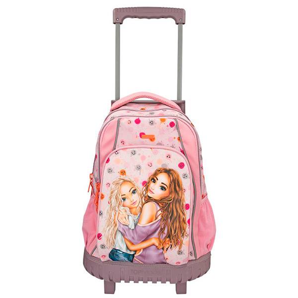 Mochila escolar con estampado de smileys en un fondo rosa claro y las dos modelos de TopModel. El mango telescopico se extiende hasta 86 cm y las ruedas son de marcha suave. Dispone de guardabarros para proteger las ruedas y evitar manchar la ropa. Para más comodidad los tirantes acolchados regulables con asa acolchada y tres compartimentos separados. Material: PES 100% Dimensiones: 24 x 32 x 51 cm