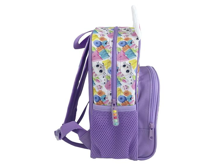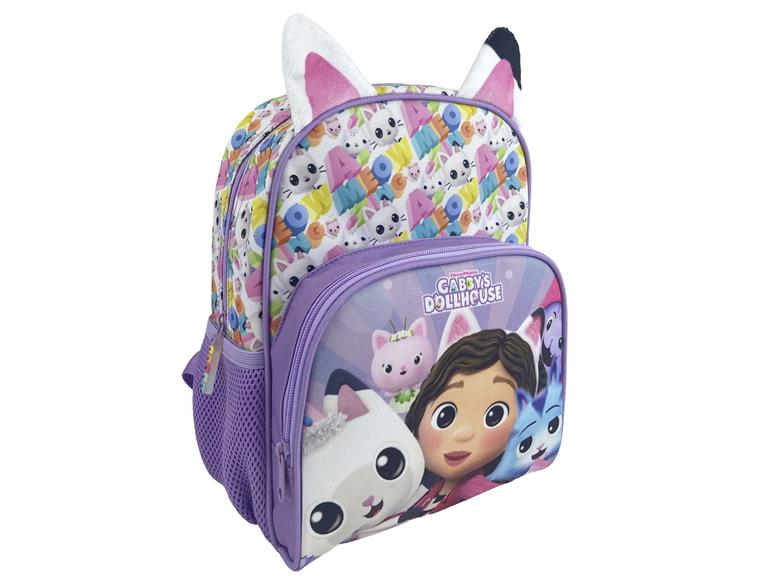 Mochila 30 cm con los personajes de Gabby’s Dollhouse. Gatos adorables, manualidades curiosas y un toque de magia! La joven amante de los gatos y su inseparable Pandy Patitas se lo pasan bomba en su mundo animado. CARACTERÍSTICAS: Fabricada en poliéster de alta calidad. Completa mochila con dos amplios compartimentos, dos bolsillos laterales para botellas con malla reforzada. Tirantes regulables, acolchados y ergonómicos para un mejor ajuste, espaldera acolchada para mayor comodidad. Cuenta con asa superior para facilitar su agarre. Su colorido y original diseño unido a sus detalles como las orejas de gato en 3D o el tirador con la silueta de gatitos en distintos colores hacen de esta mochila el complemento perfecto para los seguidores de esta conocida serie infantil. Su interior está completamente forrado para garantizar su durabilidad.