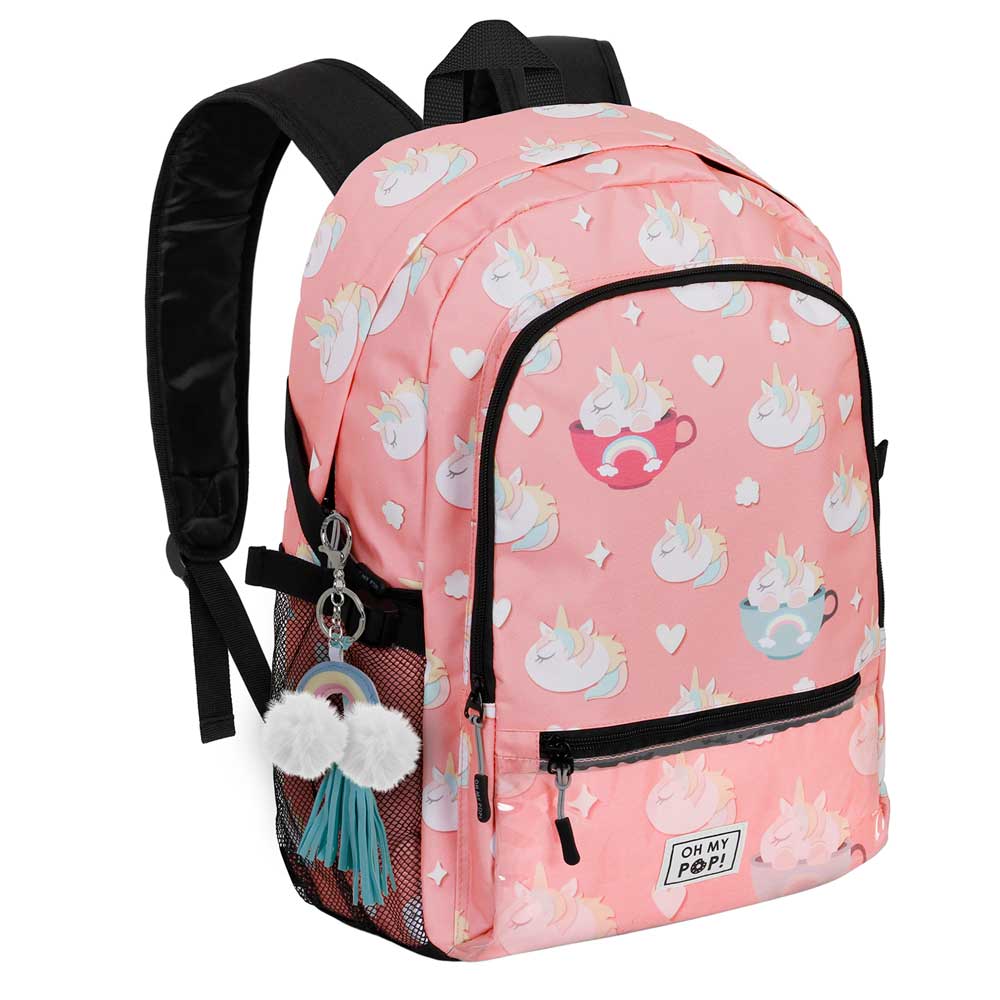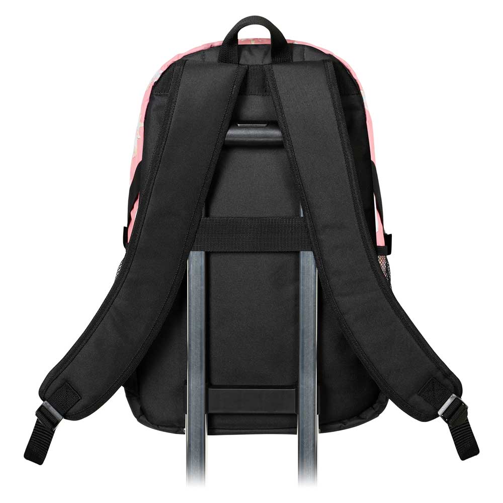 Mochila urbana ligera con un compartimento, un bolsillo frontal grande y otro transparente. Correas acolchadas ajustables, dos bolsillos laterales de malla y cinta trasera adaptable a trolley. Interior con bolsillo para dispositivos electrónicos. Medidas: 31cm x 44cm x 18cm