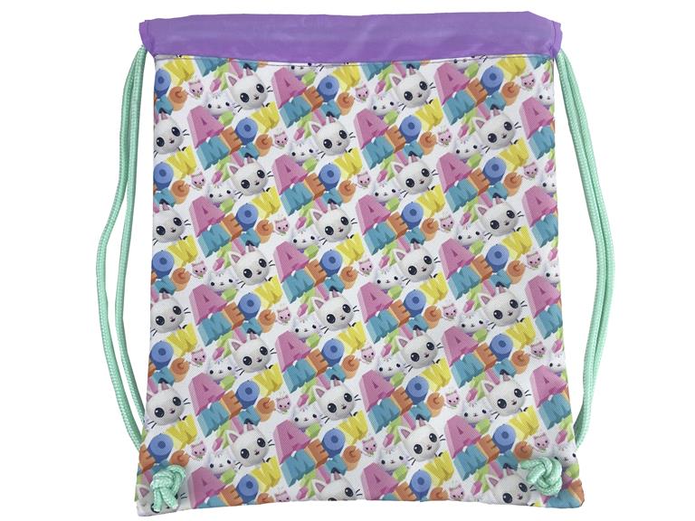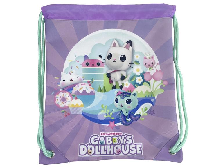 Mochila saco con los personajes de Gabby’s Dollhouse. Gatos adorables, manualidades curiosas y un toque de magia! La joven amante de los gatos y su inseparable Pandy Patitas se lo pasan bomba en su mundo animado. CARACTERÍSTICASL: Súper práctica y versátil, esta mochila saco es ideal como mochila de guarderia, playa o extraescolares. Para que tus peques lleven a la guarderia cambios de ropa, la toalla a la playa y algún juguete para disfrutar en cualquier lugar. Reforzada en sus esquinas inferiores para garantizar su durabilidad. MEDIDAS:30x1x31