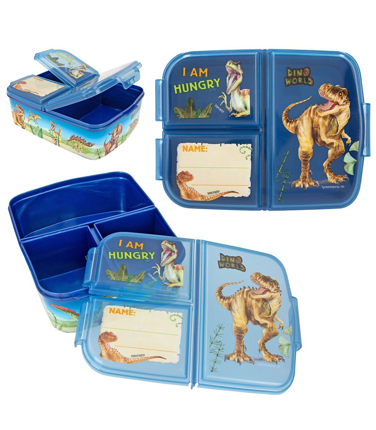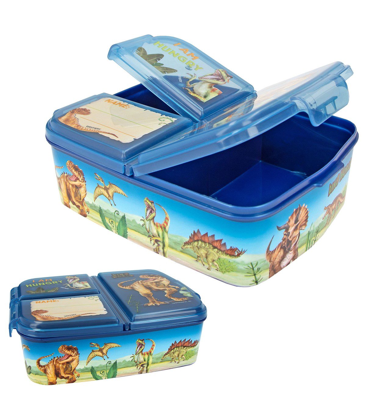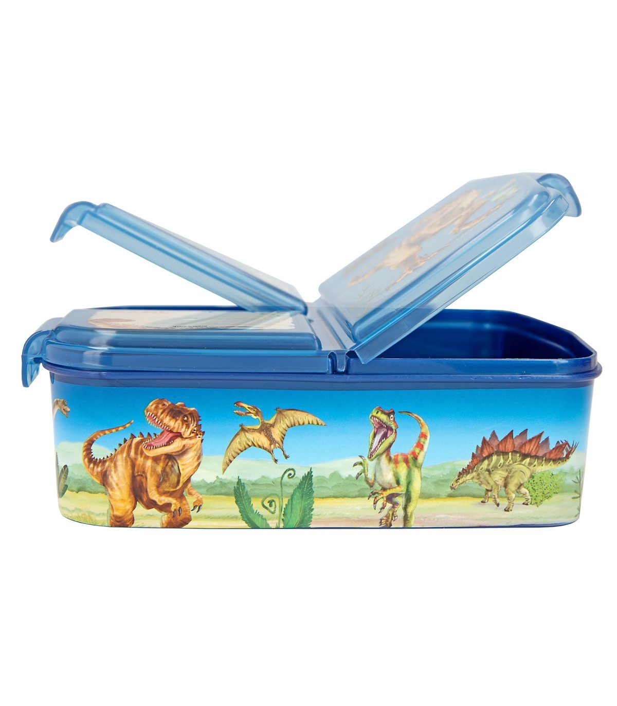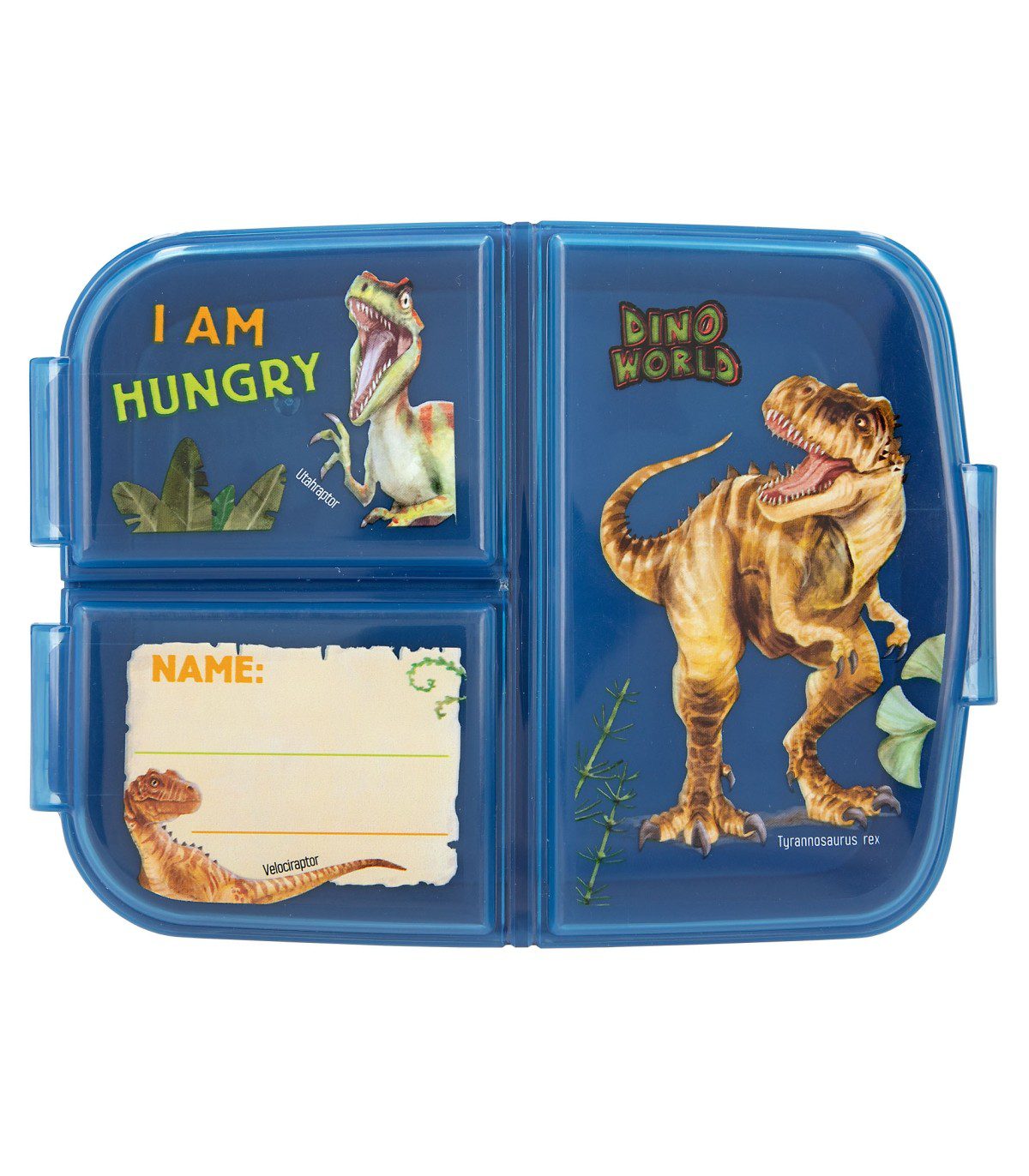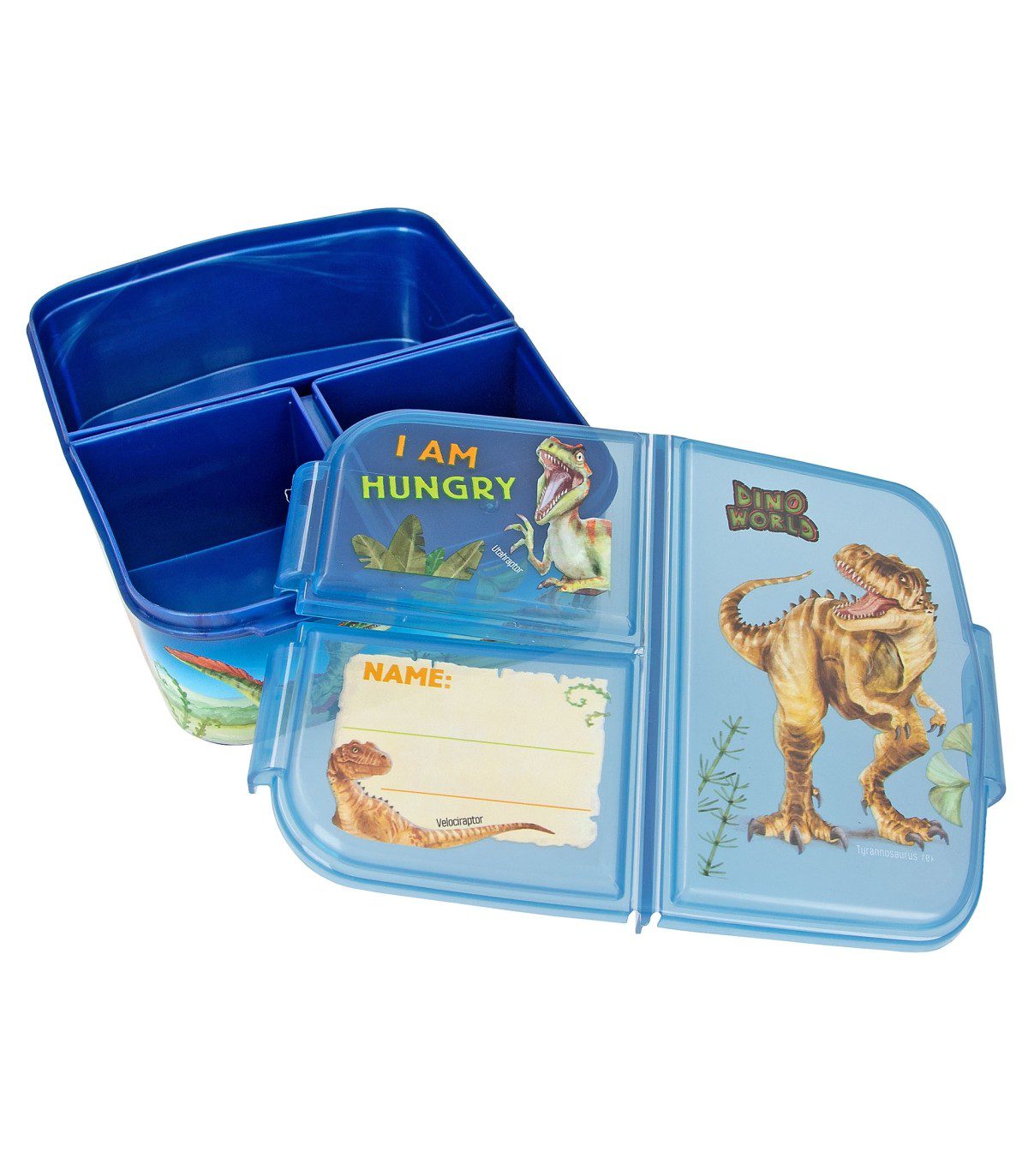 La fiambrera azul de Dino World se caracteriza por sus chulísimos motivos de dinosaurios, un lema divertido y una cuadrícula personalizable con ayuda de un rotulador de punta fina permanente (no incluido). Los tres compartimentos separados tienen un práctico cierre de clip. Se recomienda lavar a mano para proteger las ilustraciones. Producto no apto para microondas. Material: etileno-propileno, copolímero libre de bisfenol A (BPA) y de plastificantes (ftalatos).