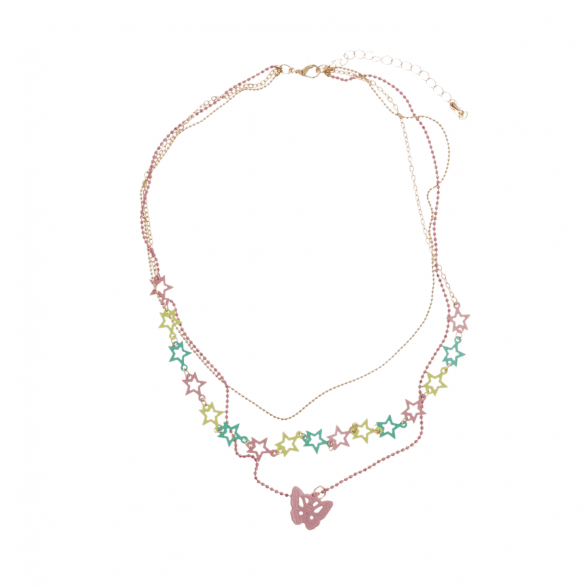 Set 3 collares en uno con cierre de estrellas, mariposas y bolitas. Tiene un cierre de mosquetón que uno los tres haciendolo uno. Materiales: 40% Cobre, 55% Hierro y 5% Aleación.