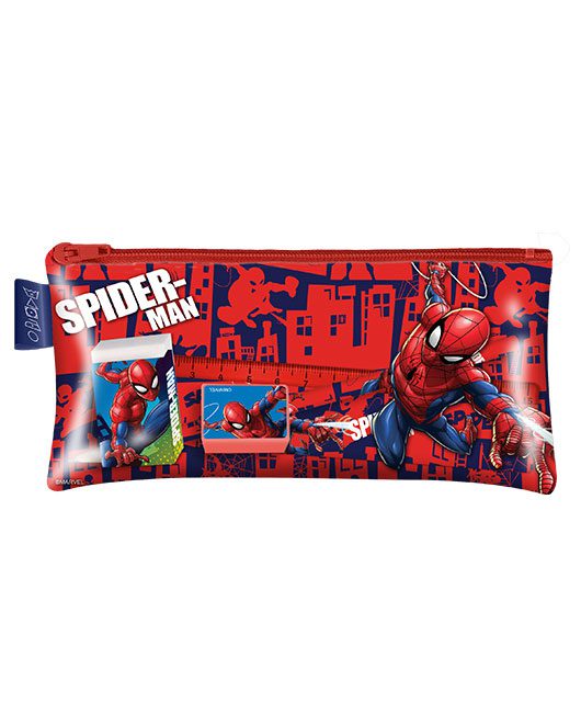Estuche Portatodo de Spiderman ideal para la vuelta al cole. Este estuche portatodo contiene cuatro piezas esenciales para ponerse manos a la obra: Lápiz Afilador Goma de Borrar Regla 15cm