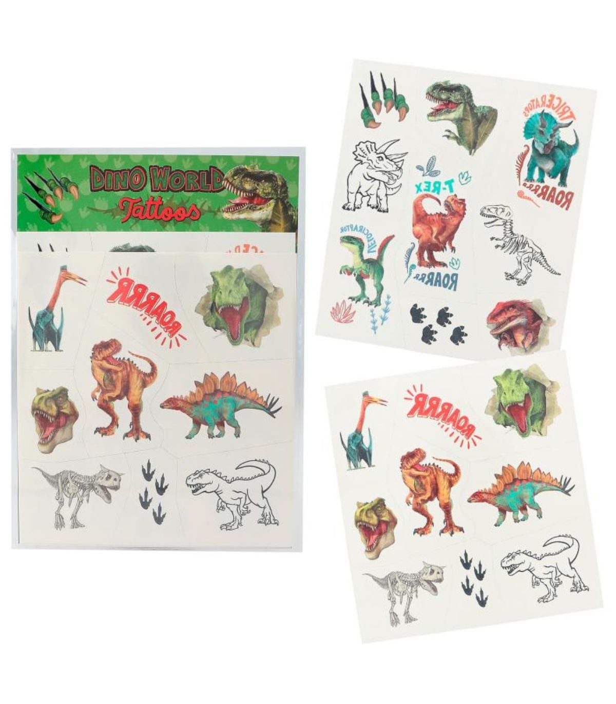 Estos tatuajes adhesivos harán disfrutar a lo grande a los fans de los dinosaurios. 2 hojas llenas de motivos del mundo prehistórico de los dinosaurios. Muy fáciles de aplicar sobre la piel. Edad: 4 años