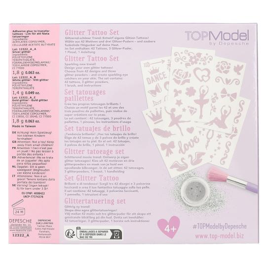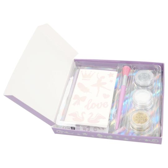 Para crear sobre la piel obras de arte preciosas y con brillo. Con el set de tatuajes de ballet de TOPModel es muy sencillo aplicar motivos maravillosos sobre la piel. Incluye 42 tatuajes adhesivos en torno al mundo del ballet, 1 pincel, 3 tarritos de purpurina (plata, blanco, oro) y sencillas instrucciones paso a paso. Recomendado a partir de 4 años. Contenido por tarrito de purpurina: 1,8 g.