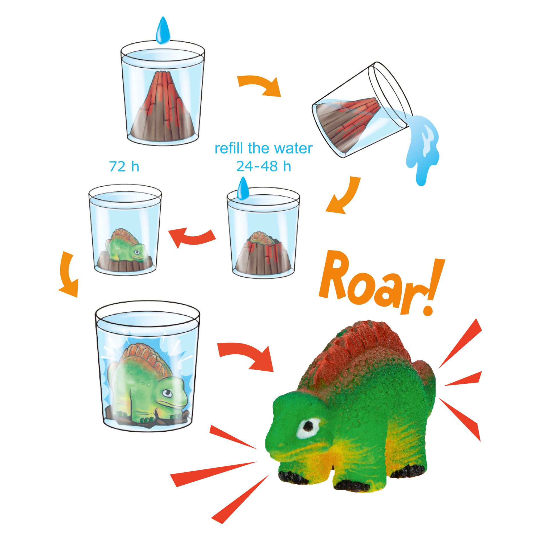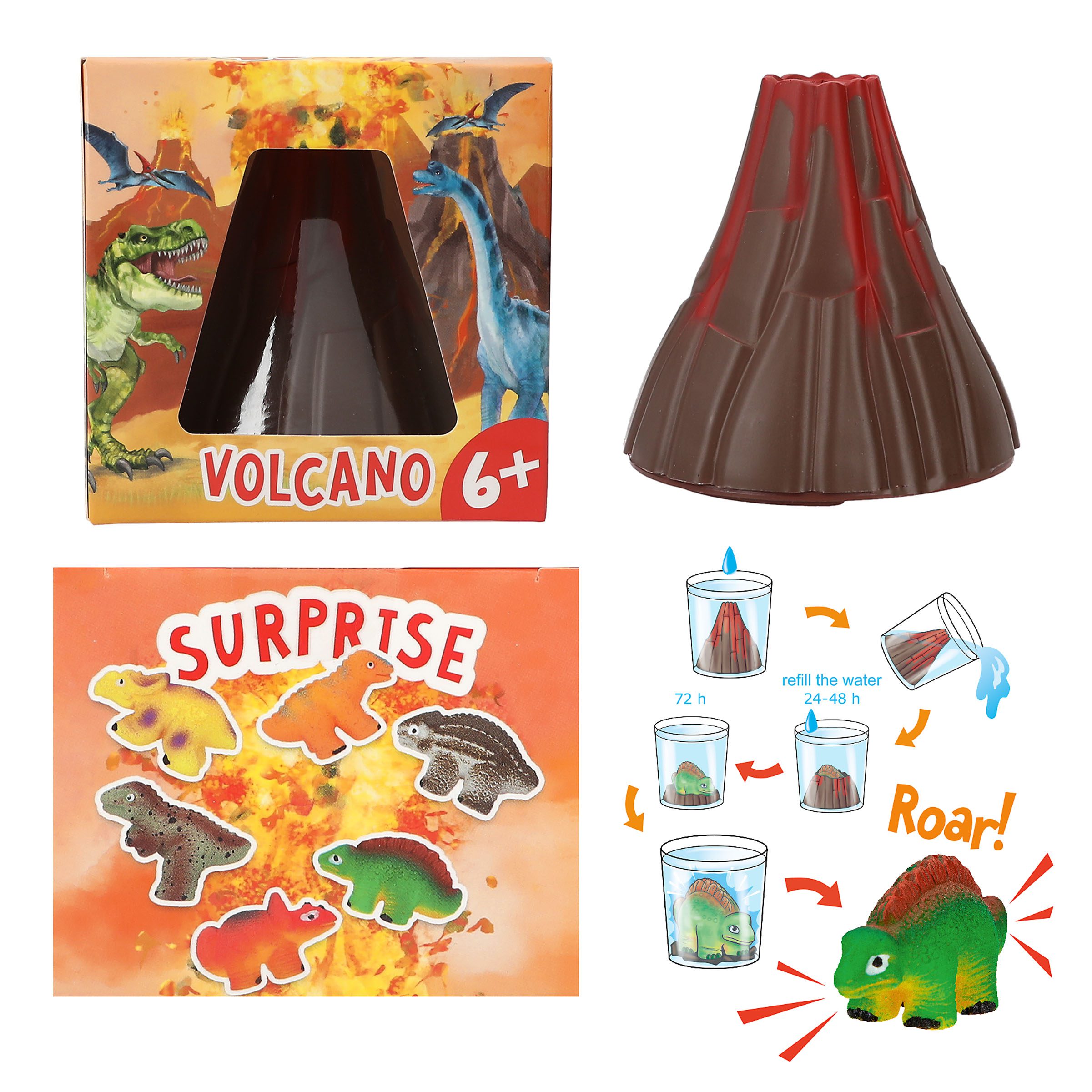 Dinosaurio sorpresa en el interior del volcán! La montaña de lava se disuelve lentamente al sumergirla en agua dejando al descubierto a uno de 6 dinosaurios distintos. Este adquirirá su tamaño definitivo en 72 horas. De Dino World. Recomendado a partir de 6 años.